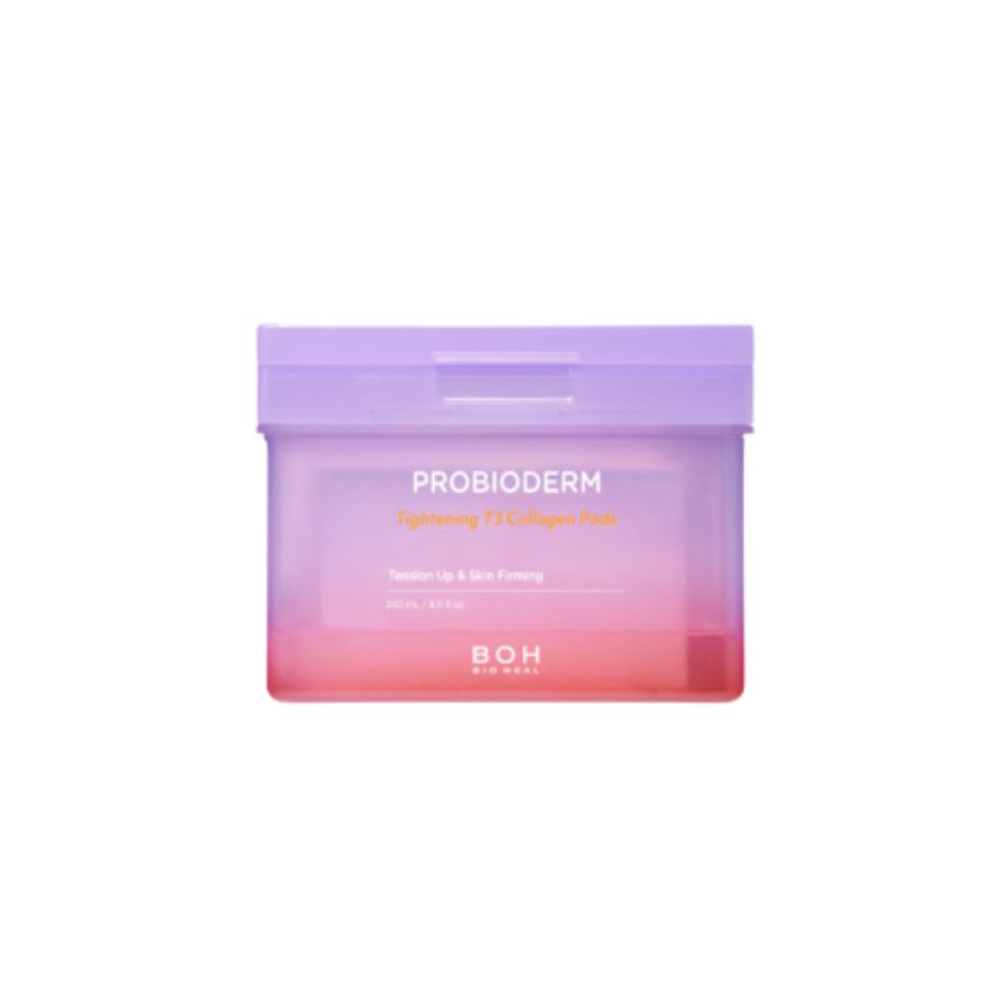The BIOHEAL BOH Probioderm Tightening T3 Collagen Pad is a premium Korean skincare product designed to enhance skin elasticity, refine pores, and provide deep hydration. Each container holds 120 large, vegan-friendly pads, which can be split into two, offering a total of 240 applications. These pads are infused with a potent blend of T3 collagen, peptides, probiotics, and capryloyl salicylic acid, aiming to rejuvenate aging skin and improve its texture.