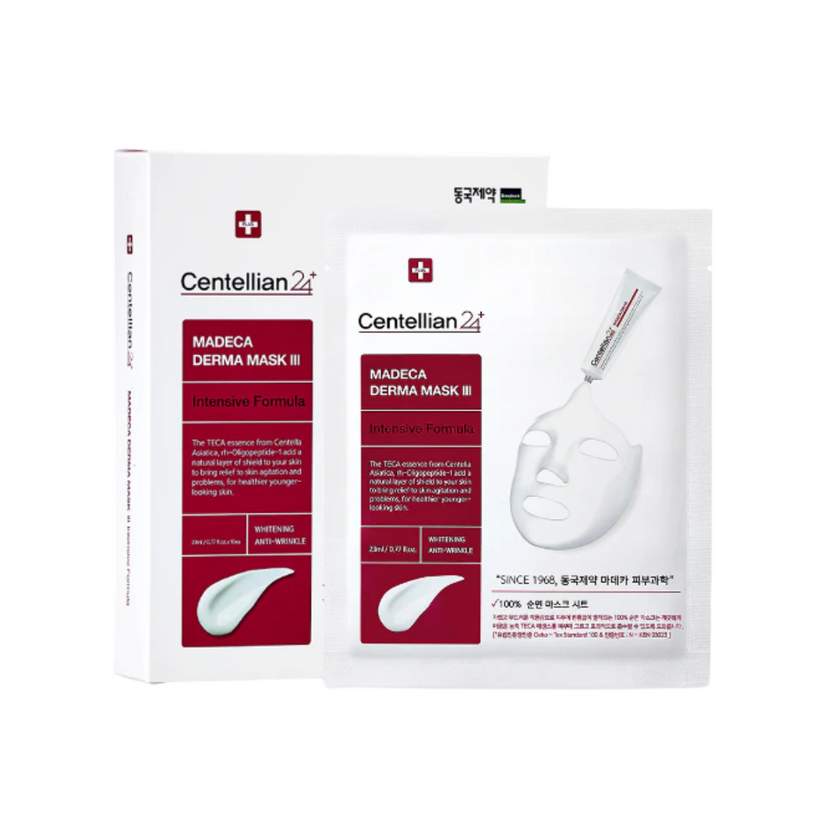 The Centellian24 Madeca Derma Mask III Brightening Formula is a premium sheet mask designed to enhance skin clarity and radiance. Formulated with TECA (Titrated Extract of Centella Asiatica) and Alpha-Bisabolol, it soothes and repairs damaged skin, promoting a healthier complexion. Infused with Glutathione, this mask brightens and deeply hydrates for a luminous, rejuvenated appearance. The 100% pure cotton sheet ensures a soft, gentle texture that adheres seamlessly to the skin for optimal absorption of active ingredients. Ideal for achieving bright, hydrated, and refreshed skin.
