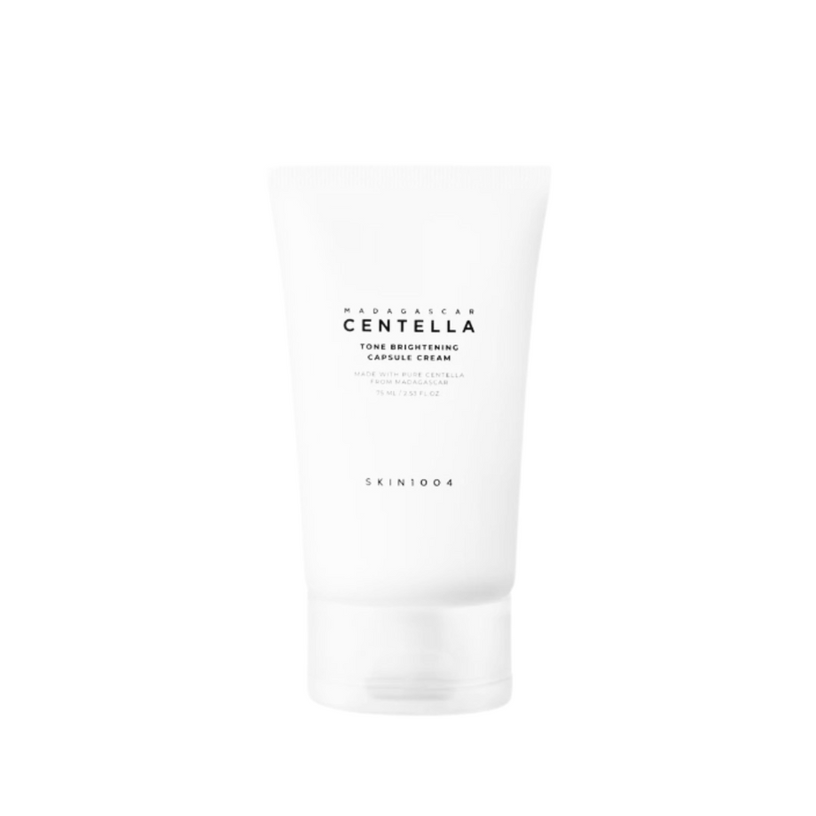 The SKIN1004 Madagascar Centella Tone Brightening Capsule Cream 75ml is a soothing and hydrating cream designed to brighten dull skin and even out skin tone. Formulated with 60% Centella Asiatica extract from Madagascar, this cream delivers calming and antioxidant benefits, making it suitable for sensitive skin. Key ingredients include MadeWhite™, a patented brightening agent containing madecassoside, which helps reduce melanin production and fade dark spots. Niacinamide and tranexamic acid further enhance skin brightening by inhibiting melanin synthesis and improving skin texture. The cream's unique "oil-in-water gel network" structure releases moisture upon application, providing a burst of hydration and leaving the skin feeling refreshed and non-sticky. Free from alcohol, parabens, and added fragrances, this product is ideal for those seeking a gentle yet effective solution for uneven skin tone and pigmentation.