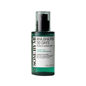 The SOME BY MI AHA.BHA.PHA 30 Days Miracle Serum Light is a skincare product designed to exfoliate the skin using AHA, BHA, and PHA acids, which help remove dead skin cells and excess sebum. It also contains soothing ingredients like tea tree leaf water and centella asiatica extract to calm and protect the skin. The serum is designed to improve skin texture, reduce the appearance of pores, and promote a clearer complexion over time. Its lightweight formula is suitable for various skin types, including oily and combination skin.