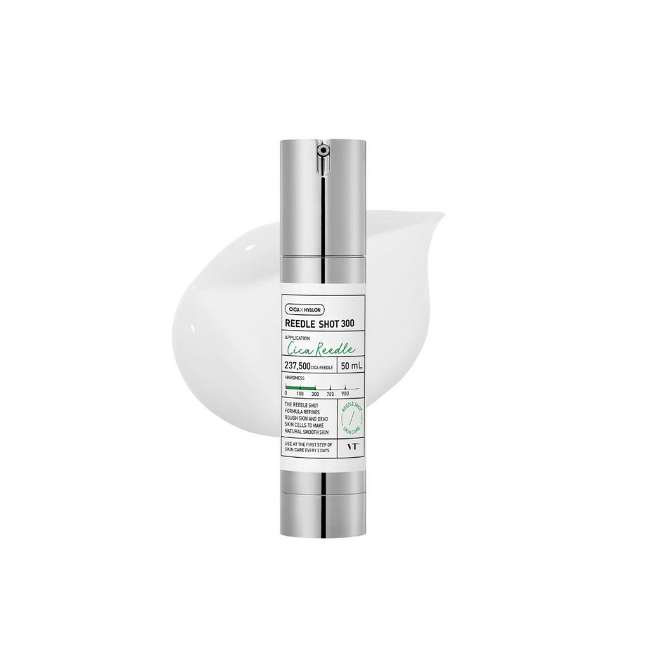The VT Cosmetics Reedle Shot 300 Essence is a potent skincare treatment designed to enhance skin texture, minimize pores, and promote a radiant complexion. This advanced essence utilizes the brand's proprietary Cica Reedle™ technology, which employs micro-sized, naturally derived particles to stimulate the skin and facilitate deeper absorption of active ingredients. Infused with a blend of Centella Asiatica Extract, Triple Hyaluronic Acid, Green Propolis Extract, and an Amino Acid Complex, it offers soothing, hydrating, and barrier-strengthening benefits.